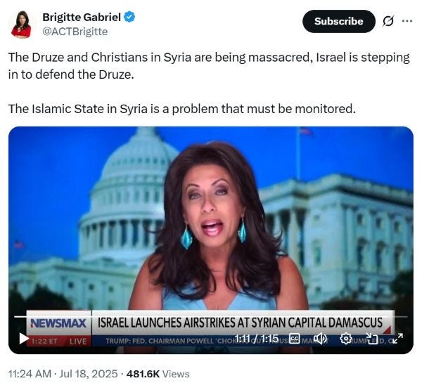 Playback speed×Share postShare post at current timeShare from 0:000:00/0:00Transcript6314Brigitte on Druze Genocide in SyriaThe Al Qaeda President of Syria Wiping Out Christians, Alawites, and NOW Druze!Act for AmericaJul 22, 20256314ShareTranscriptRepost and Follow on X Below:ShareDon’t Miss Out on Our 2025 America First Celebration Half-Off Discount for New and Returning Subscribers for a Limited Time!This Substack is reader-supported. To receive new posts and support my work, consider becoming a free or paid subscriber.SubscribeDiscussion about this videoCommentsRestacksBrigitte Gabriel on News You Can Act On NYT Best Selling Author and World Renowned Political Commentator.NYT Best Selling Author and World Renowned Political Commentator.SubscribeListen onSubstack AppRSS FeedAppears in episodeAct for AmericaRecent EpisodesWhen Evil StrikesDec 16, 2025 • Act for AmericaA Personal Warning from Brigitte GabrielNov 2, 2025 • Act for AmericaExposing the Red-Green AxisNov 1, 2025 • Act for AmericaFighting Jihadi-Commie MamdaniOct 30, 2025 • Act for AmericaGavin Newsom's Rags to Riches LieOct 29, 2025 • Act for AmericaShut Down for Illegal Healthcare!Oct 7, 2025 • Act for AmericaWatch Brigitte on the Gaza War and MoreJul 29, 2025 • Act for America