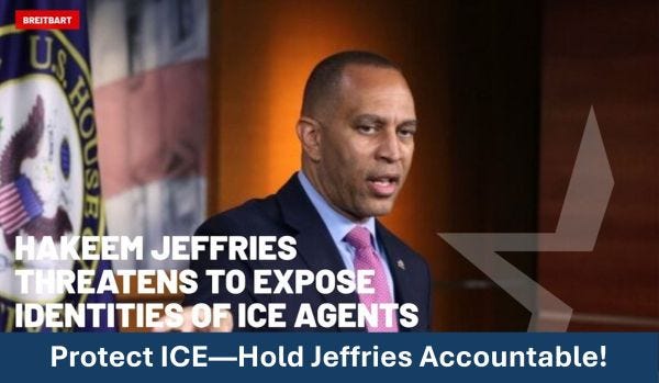 Hakeem Jeffries’ threat to unmask ICE agents is a disgraceful betrayal of his oath to “support and defend the Constitution of the United States against all enemies, foreign and domestic.” As a member of Congress, he swore to protect this nation, yet he endangers the agents who shield us from cartels and gangs. His words embolden criminals, undermine law enforcement, and weaken national security. Any Democrat who joins Jeffries in this dangerous campaign to dox ICE agents shares in this shame, aligning against the safety of our communities and the integrity of our borders.