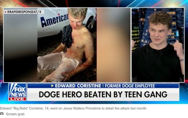 Edward “Big Balls” Coristine—a 19-year-old patriot who traded his DOGE badge for a life of quiet heroism—was savagely beaten by a mob of teenagers during an attempted carjacking in August.