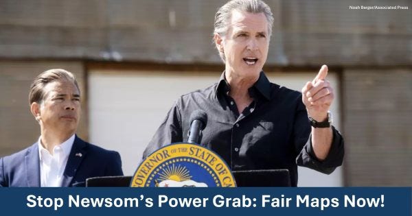This is a fight to take back California from Newsom and Democrat lawless electoral theft and political corruption. We cannot allow his Democratic authoritarian gerrymandering machine to permanently silence our voices and vote, turning the state into a one-party fiefdom.