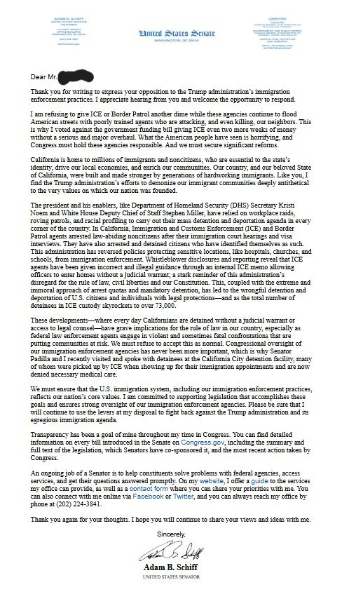 The constituent did not make an unreasonable demand. Contrary to what Senator Schiff’s letter suggests, the concerned Californian contacted their U.S. senator—using ACT for America’s legislative action tool—to urge lawmakers to fund the Department of Homeland Security and prevent a government shutdown—emphasizing the vital role Immigration and Customs Enforcement plays in protecting American communities.